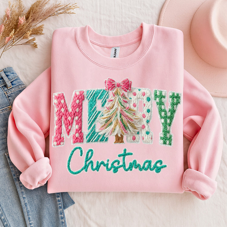 Merry Christmas Faux Crochet Sweatshirt – Pink Holiday Sweater with Tree & Bow | Cozy Festive Pullover Gift | Merry Christmas | Xmas | Holiday Sweater For Women