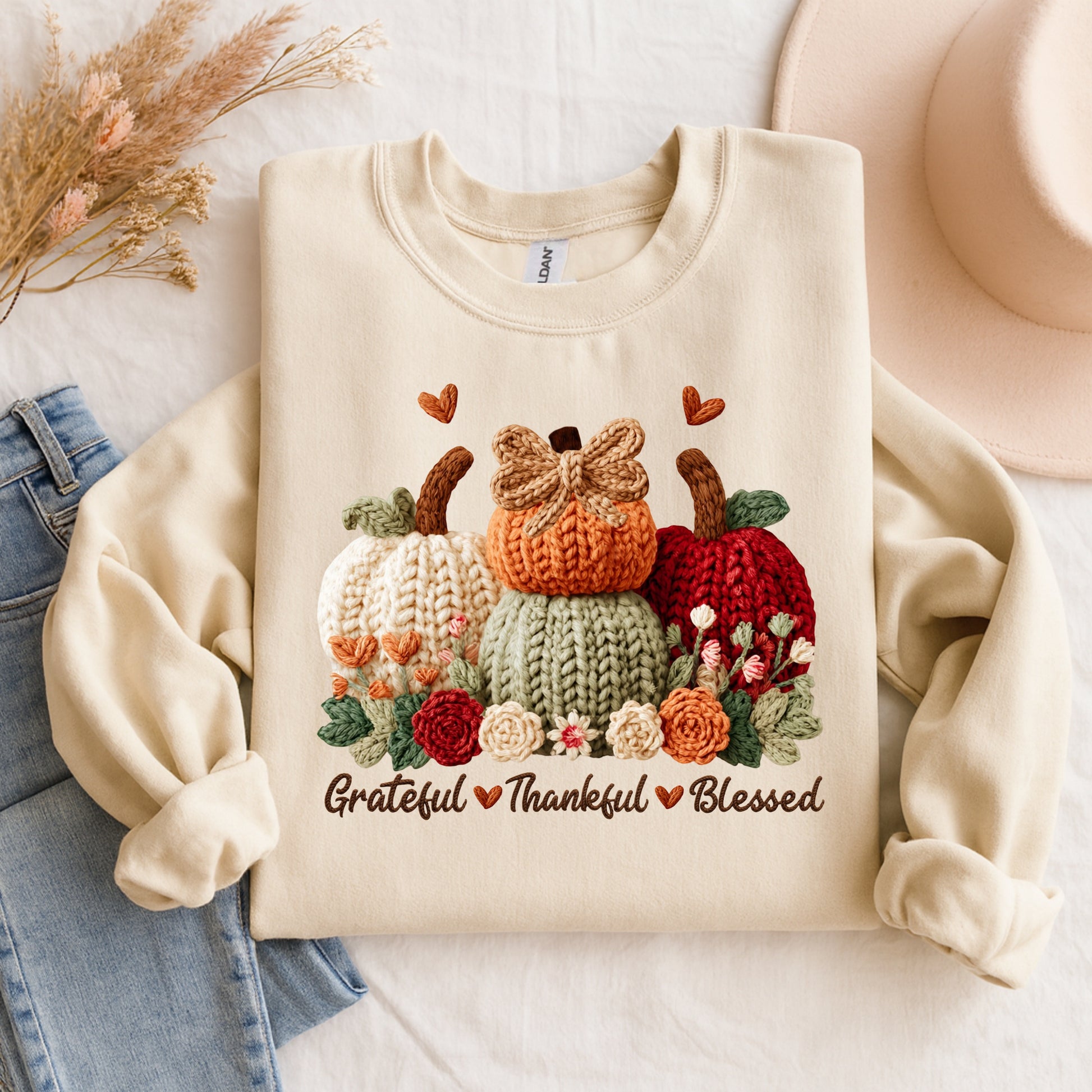 Faux Crochet Grateful Thankful Blessed Fall Sweatshirt – Cozy Pumpkin Autumn Pullover, Thanksgiving Crewneck for Women, Pumpkin Patch Sweater, Fall Season, Thanksgiving Top